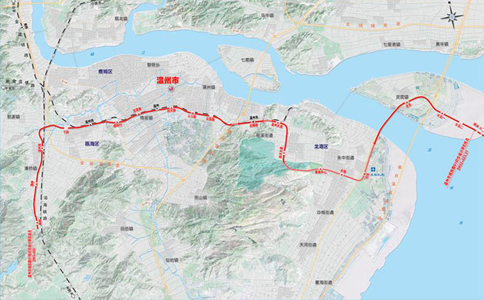 S1線一期工程:西起沿海鐵路溫州南站南端潘橋鎮(zhèn),向東北繞出至溫州西站,沿既有金溫鐵路通道至溫州東站,過溫州東站后線路折向西南沿龍灣區(qū)南洋大道、前房路至機場,在機場航站樓西側設機場站,出站后向北跨甌江南口至靈昆島折向東至一期工程終點甌采站。